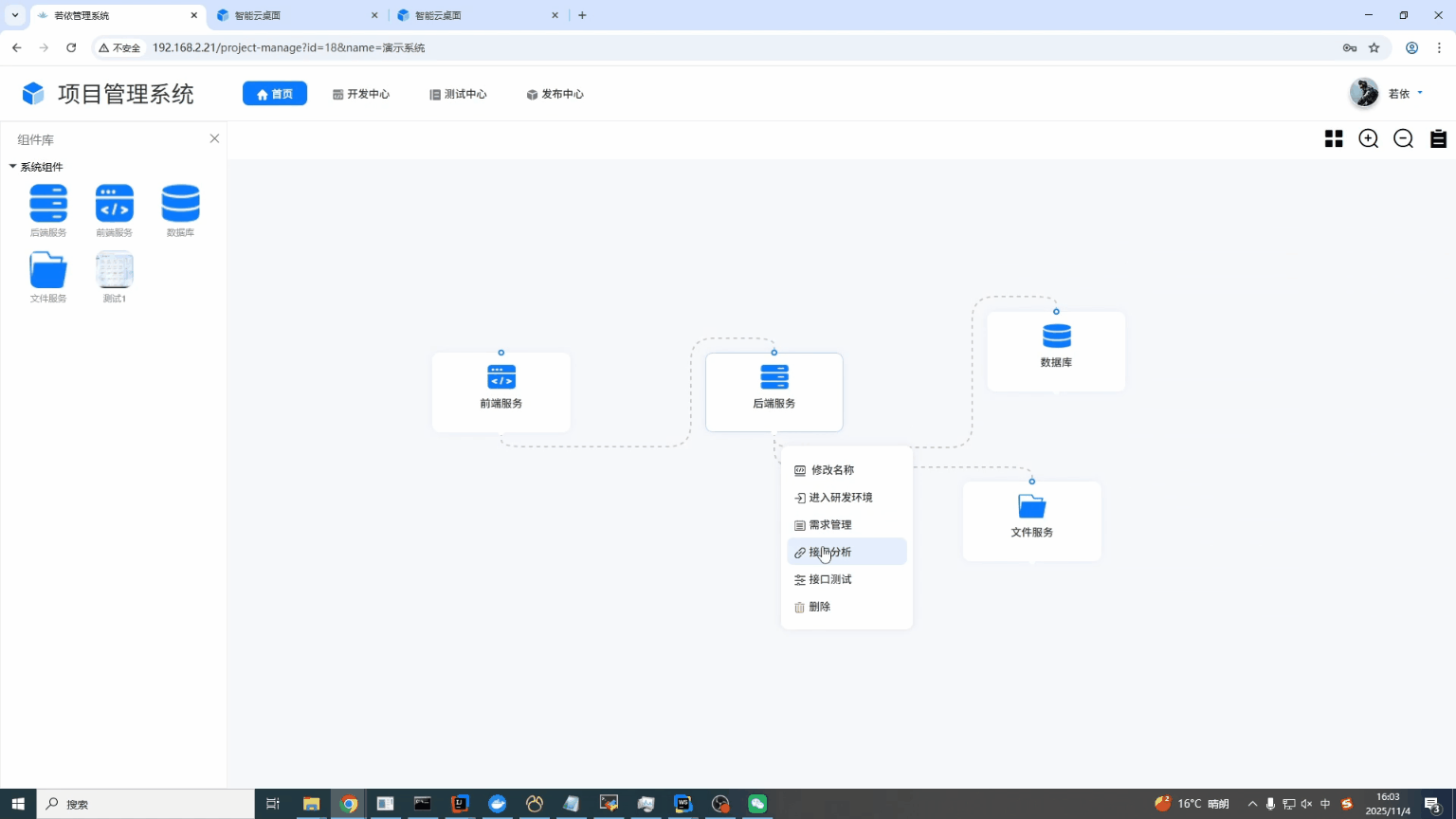 系统的第一个使命,就是提供统一的需求管理体系。通过“系统拓扑图”的方式进行规划,每个拓扑节点即代表一个服务。系统支持对每个服务进行多维度描述:总体要求、功能目标、接口定义、性能标准、部署环境与开发依赖。