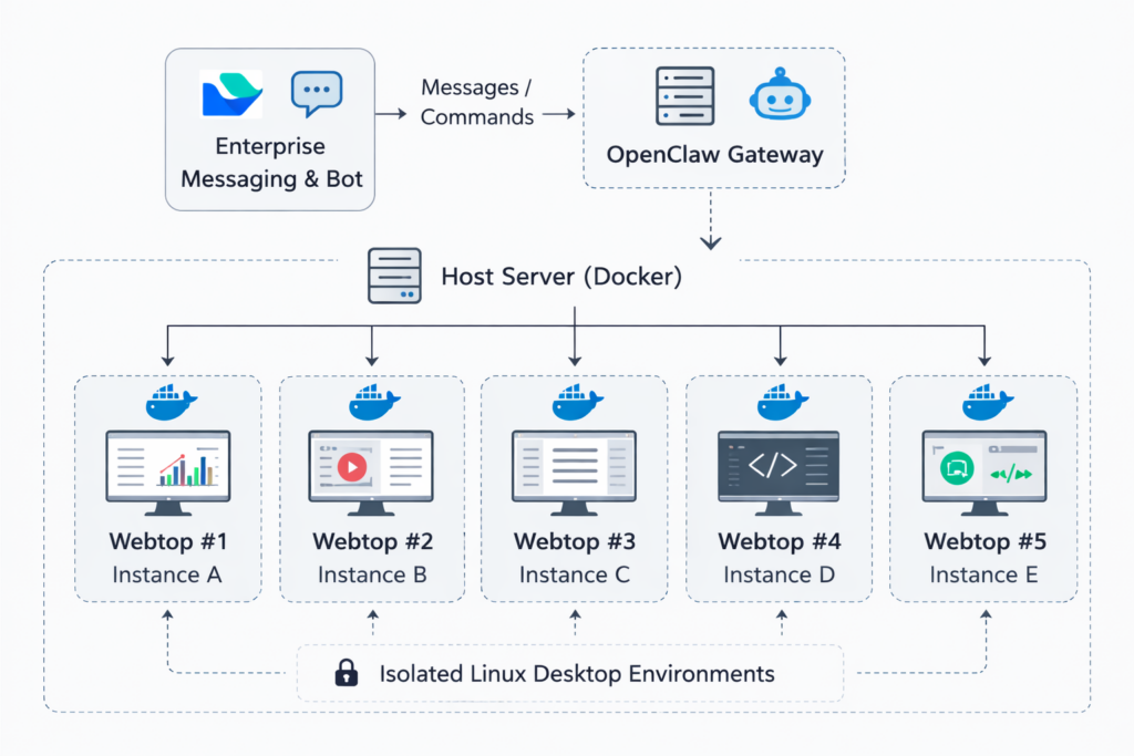 B站运营、抖音运营、发文兼活动组织、小说平台开发、漫剧平台开发。五个角色,五个独立容器环境,通过飞书统一调度。我们写了批量部署脚本,设计了统一入口,把所有数字员工拉进一个群聊,在群里分配任务,仿佛真的在管理一个团队。见这篇博文(一台服务器批量养 5 个“数字员工”:Webtop + OpenClaw + 飞书机器人实战 – 王志刚 | ( frogchou ))