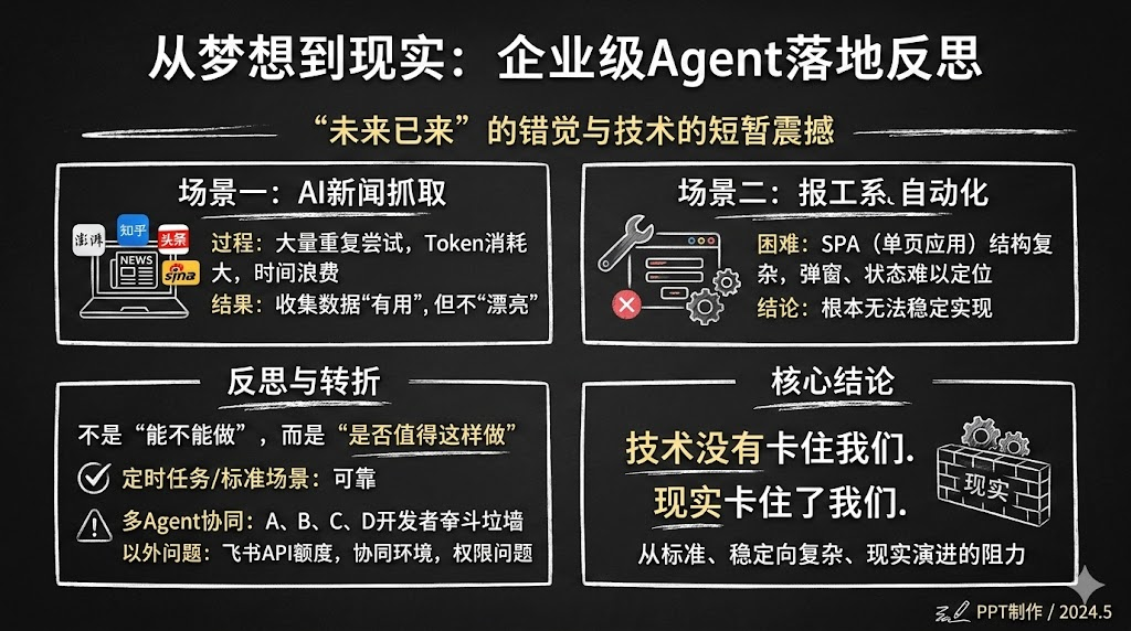 但当我们设想多Agent协同——A开发、B审查、C测试、D发布——问题已经不再是技术。飞书API调用额度迅速触顶。协同环境尚未搭建。代码仓库权限、共享任务清单、部署服务器,这些现实问题全部摆在面前。