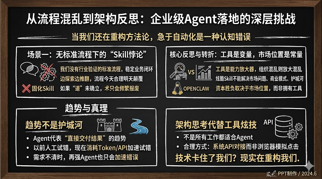 Skill适合的是高度标准化的流程。银行清算、流水线生产、成熟行业操作规范。我们的小团队连自己的方法论都还在不断重构,却急于把这种不稳定的认知自动化。这本身就是悖论。
